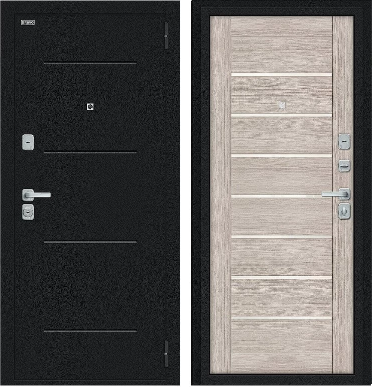 Надежная входная Дверь Браво Техно/BChrome Букле черное/Cappuccino Melinga премиум класса по цене 34 759 руб. Большая толщина стали защитит от проникновения в ваш дом, квартиру или коттедж. Используется очень качественная фурнитура: замки, цилиндры, ручки, защелки. Покрытие и отделка двери изготовлено под внимательным контролем производителя. Дверь имеет долгий срок службы и гарантию.